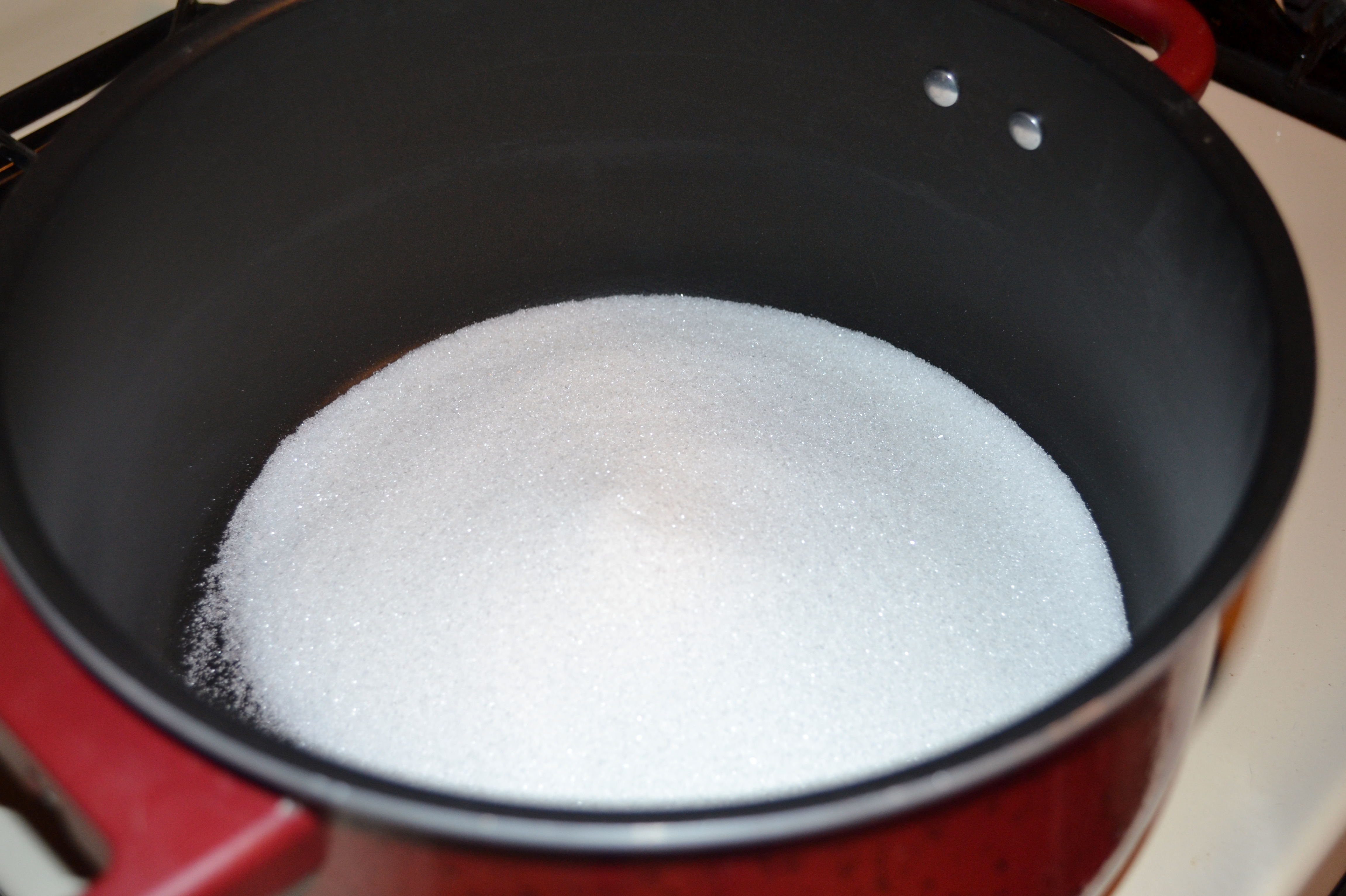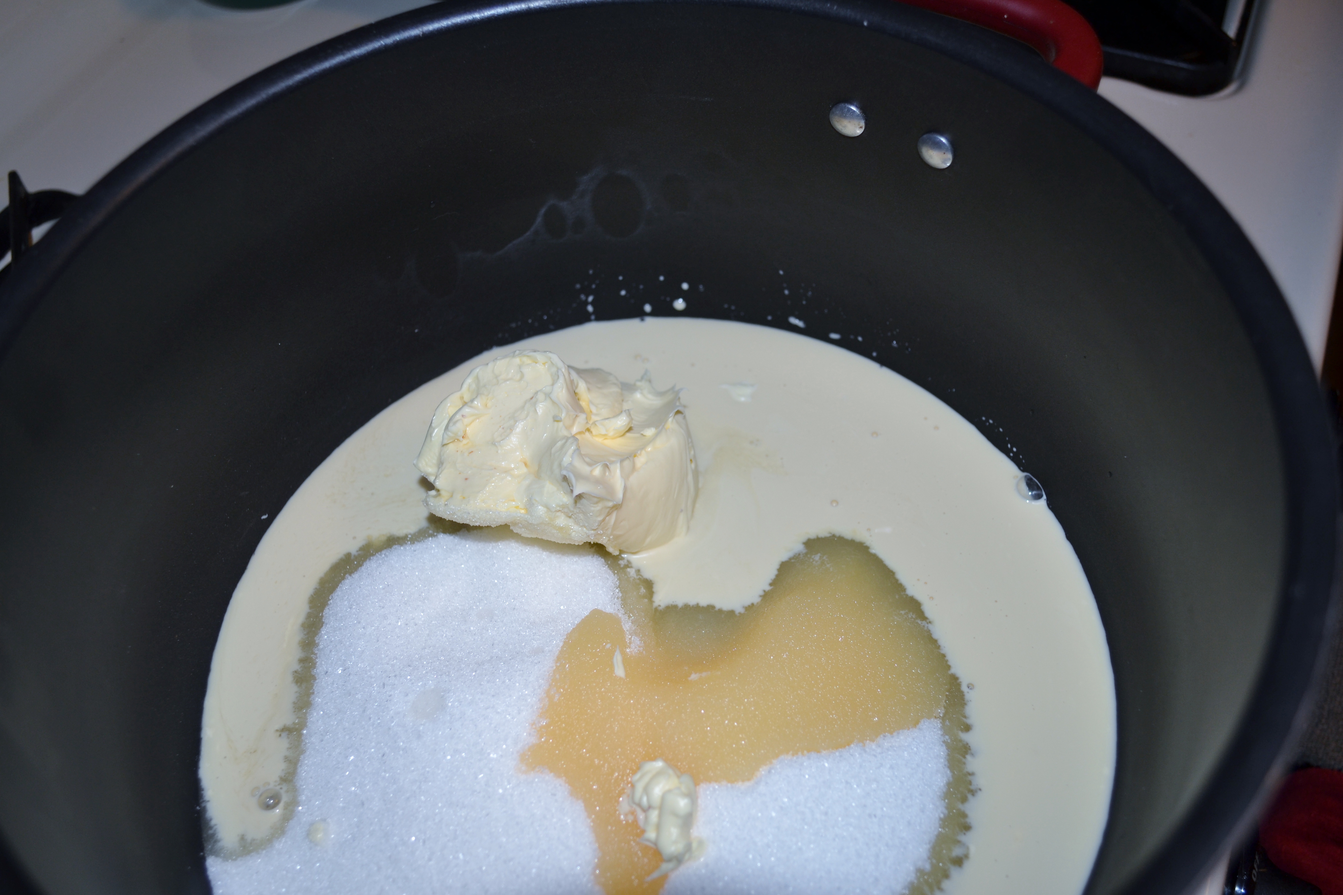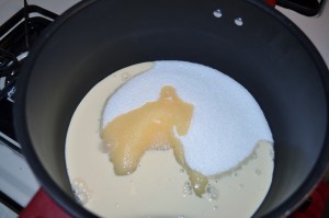First I picked the biggest sauce pan I own and in it I began to follow the first few instructions. Add white sugar – 1/2 cup canned milk – STOP!