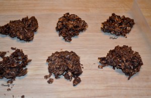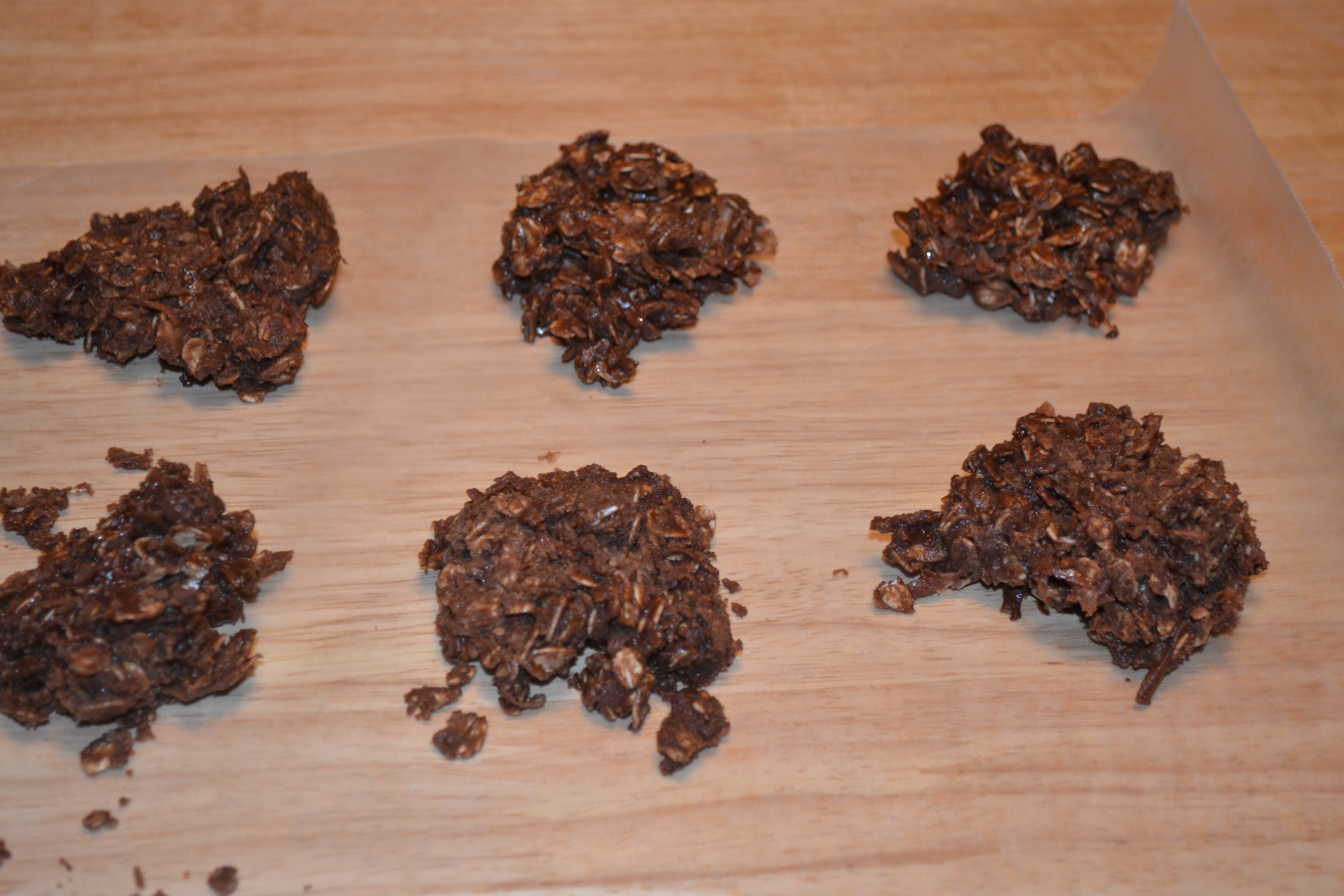Mix together 2 1/2 cups oatmeal, 1/2 cup cocoa powder, and 1/2 cup coconut. Mix well with milk mixture. Drop by spoonfuls onto waxed paper or greased cookie sheet.