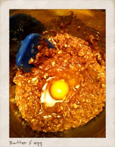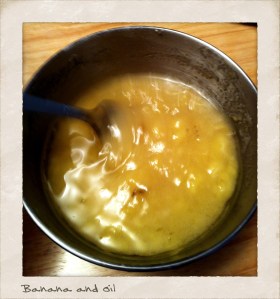 Stir in the oats. thoroughly beat together until blended – the banana, sugar, and oil.