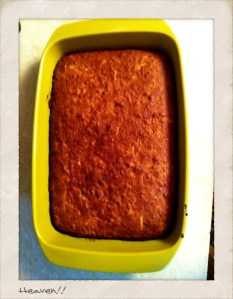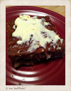 The husband was lovin’ this too. It’s is rather a thin cake so I think you could probably double the recipe (for this sized pan) but you would have to really watch your bake time too.