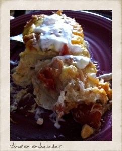 Spread 1/2 cup mixture on bottom of lightly greased 13×9 baking dish. To tortilla’s, add two heaping spoons of chicken mixture and a bit of shredded cheese. Roll, fold in the ends and place in pan. Repeat for the remaining tortillas. Spread the rest of the soup mixture on the top of the enchiladas and any remaining chicken mixture (if there is any). Then top with shredded cheese and bake at 350* for 20 minutes or until heated through.