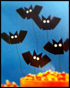 1. Print bat template and cut out with scissors. Place template on black construciton paper, trace with pencil and cut out. Repeat until you have the number of bats you want.
